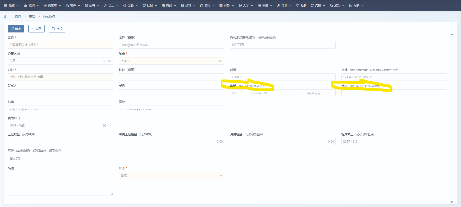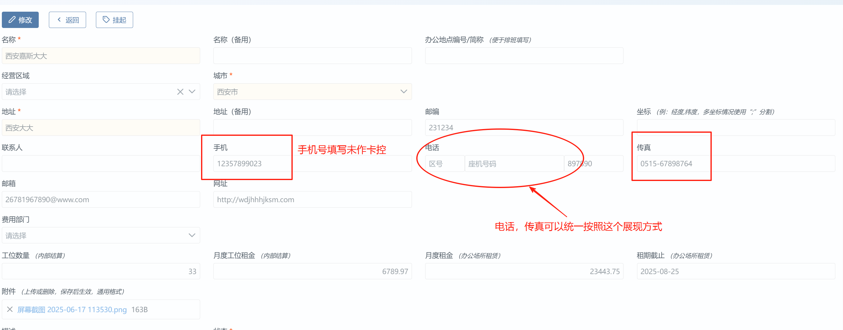 问题① 电话,传真,可以参考组织—办公点的的电话展现形式,全局统一
