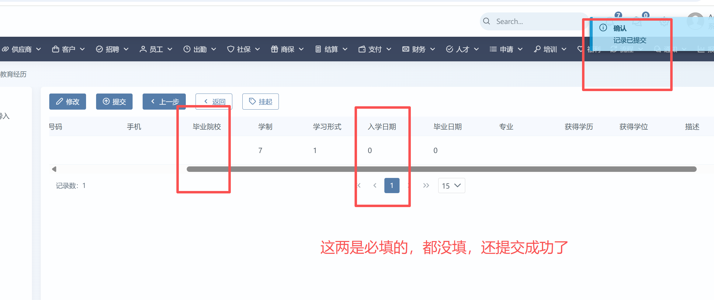 1、系统界面 毕业院校,入学日期是必填,文件中未标记未卡控
