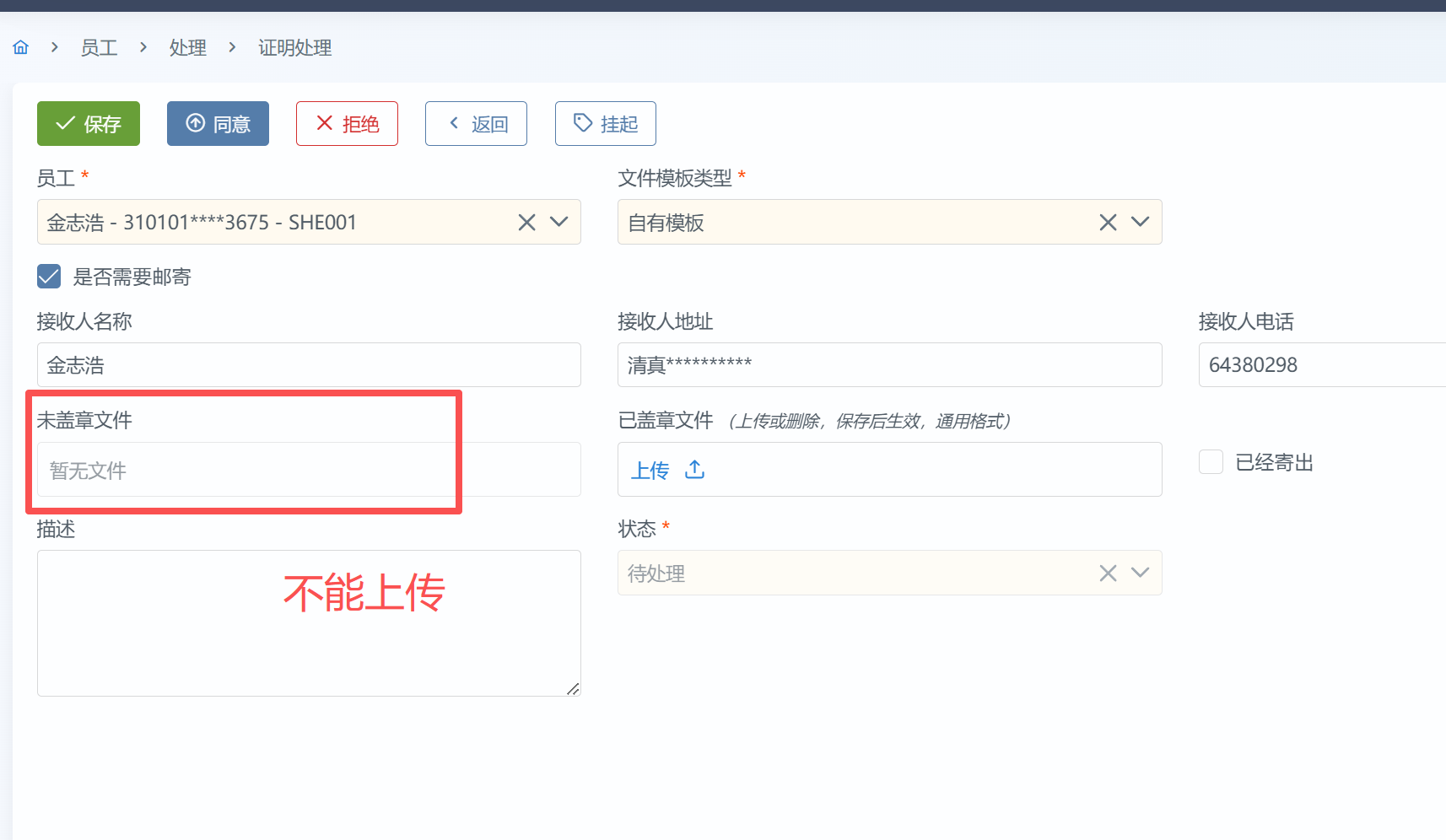 Sherry, 员工 -> 处理 -> 证明文件中不能上传未盖章合同是正确的,此处是HR处理来自员工申请中的模板。因此未盖章的合同是员工在移动端上传的。