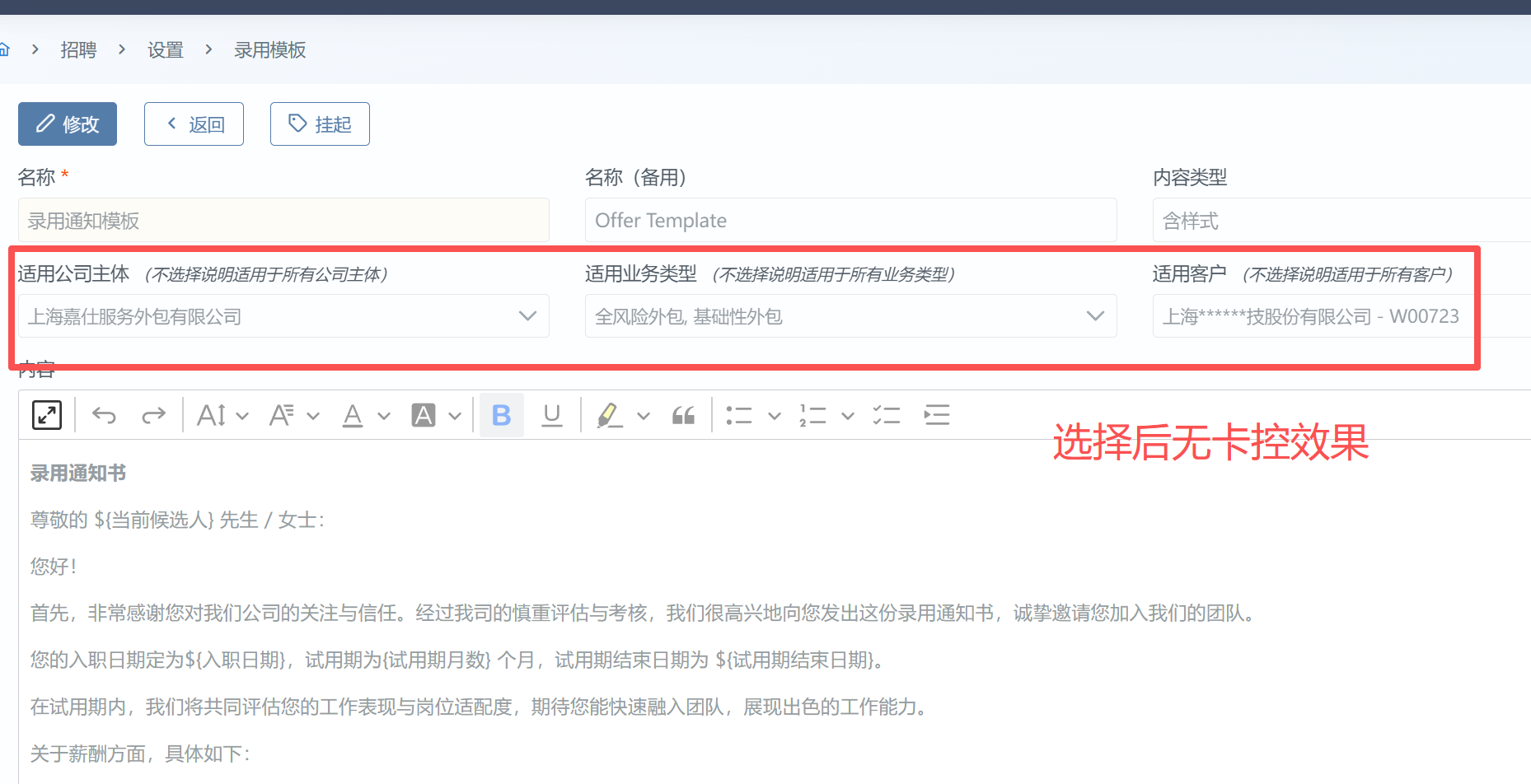 - 主题 从 【招聘-录用模板】 变更为 【招聘-录用模板】@未通过