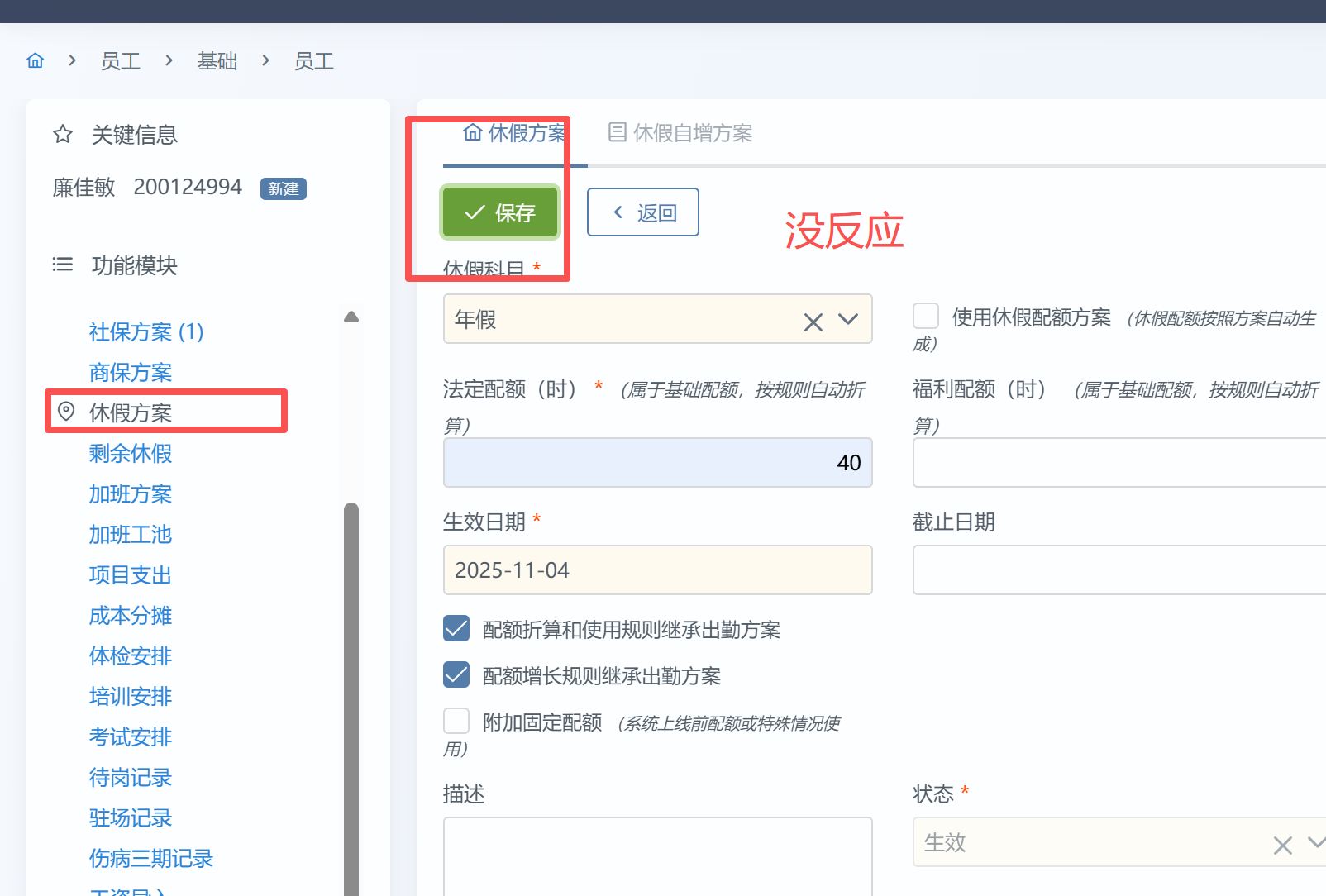 - 主题 从 HCM【用工-休假方案】新建状态下的用工保存休假方案没反应 变更为 【用工-休假方案】新建状态下的用工保存休假方案没反应
