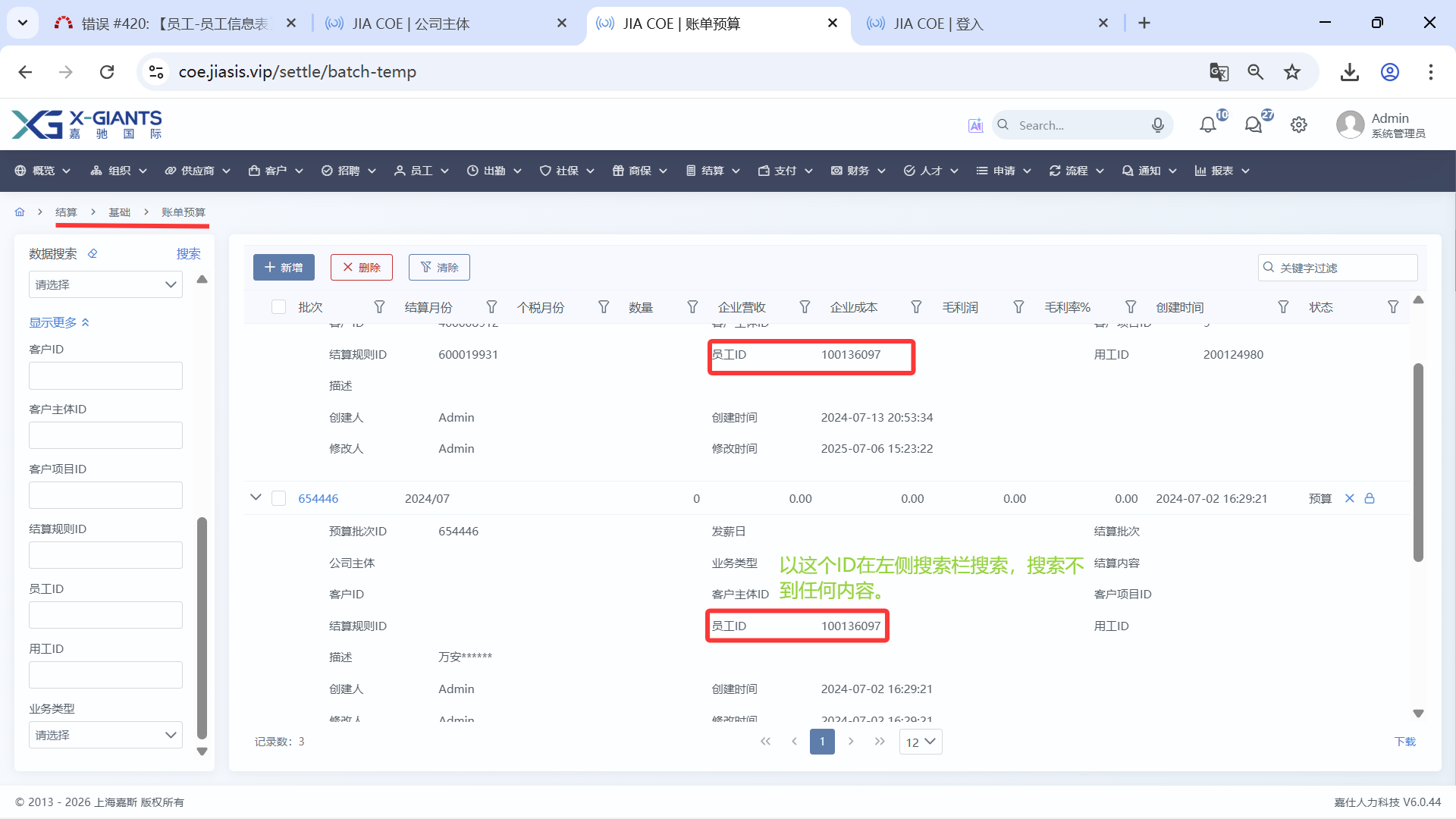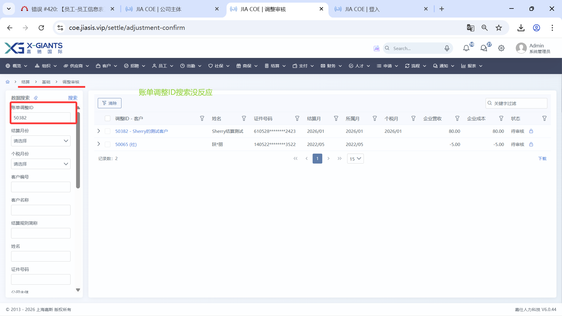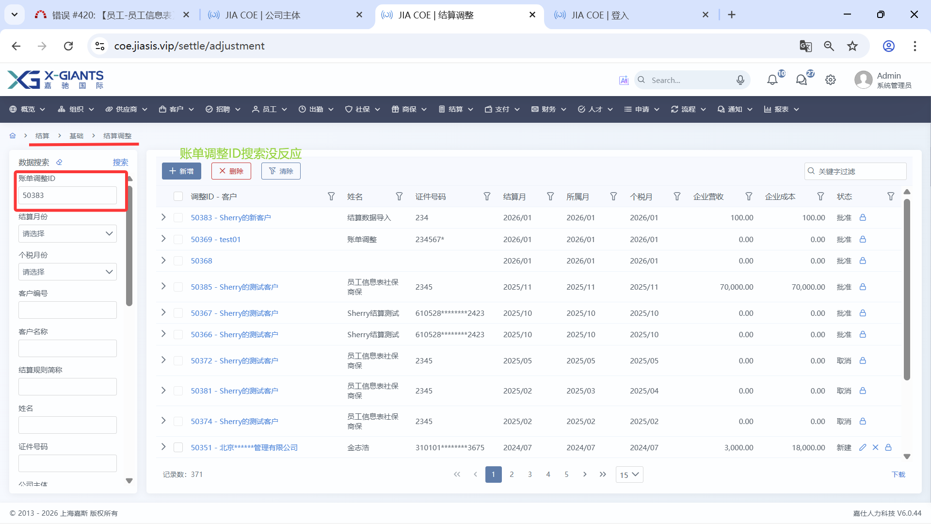 账单预算、账单台账、结算调整和调整审核的ID搜索没反应。账单预算和账单台账更多搜索出来与现有的不一致。
